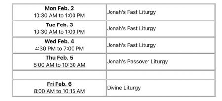 The Service Schedule of Jona's Fast & Passover Week(new):